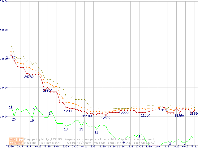 Socket A (Thunderbird,PGA,FSB 200MHz,L2 256KB)の最安値推移