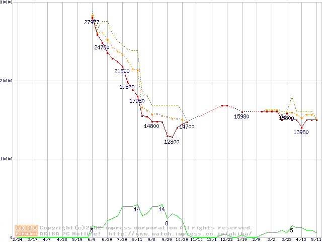 Socket A (Thunderbird,PGA,FSB 200MHz,L2 256KB)の最安値推移