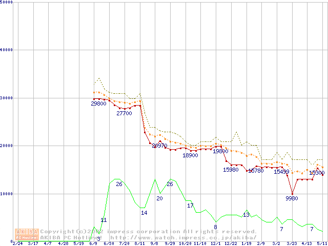 Socket A (Palomino,PGA,FSB 266MHz,L2 256KB)の最安値推移