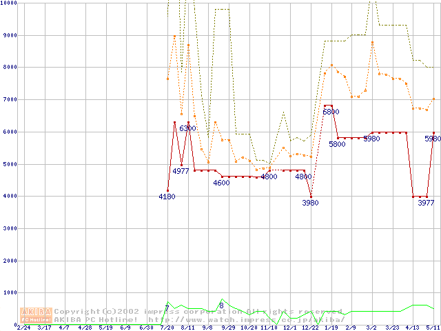 PC133 SDRAM DIMM CasLatency=3 ECC対応 Registeredタイプの最安値推移