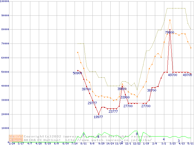 PC133 SDRAM DIMM CasLatency=3 ECC対応 Registeredタイプの最安値推移