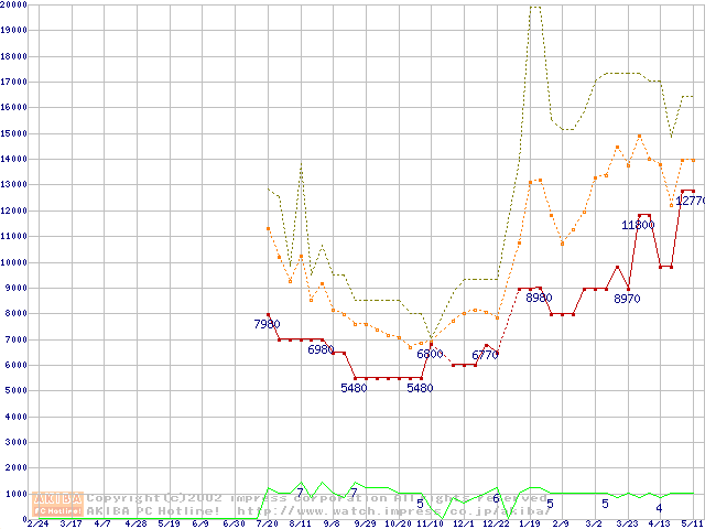 PC100 SDRAM DIMM CasLatency=2 ECC対応 Registeredタイプの最安値推移