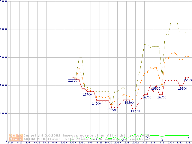 PC100 SDRAM DIMM CasLatency=2 ECC対応 Registeredタイプの最安値推移