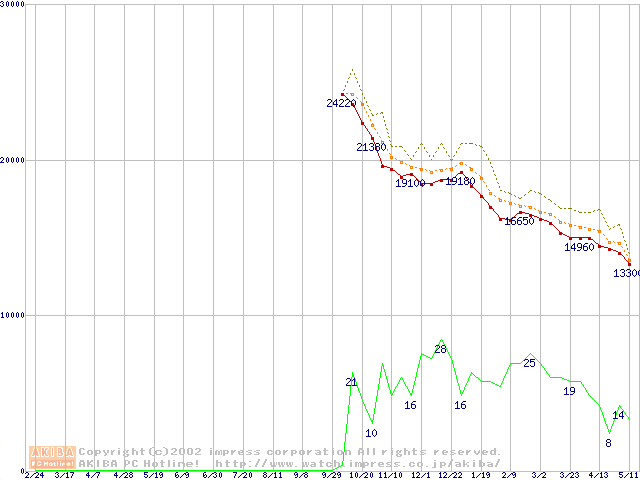 Socket A (Palomino,OPGA,FSB 266MHz,L2 256KB)の最安値推移
