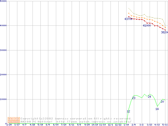 Socket 370 (FC-PGA2,FSB 133MHz,L2 512KB)の最安値推移