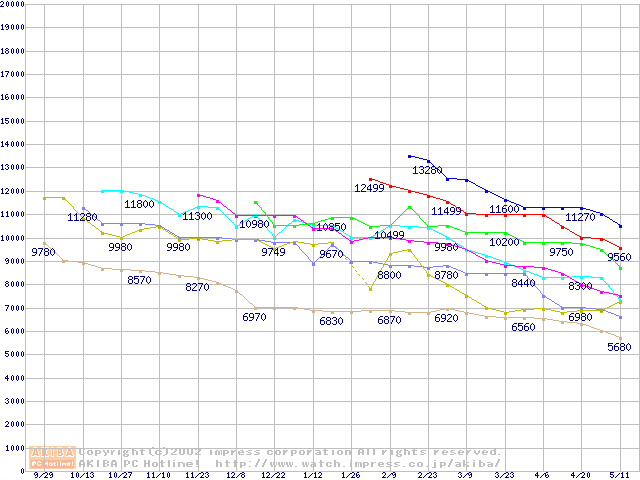 | [↓次グラフ]: | Socket A (Spitfire,PGA,FSB 200MHz,L2 64KB)の最安値推移 |