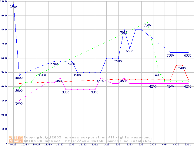 | [↑前グラフ]: | Socket A (Spitfire,PGA,FSB 200MHz,L2 64KB)の最安値推移 |