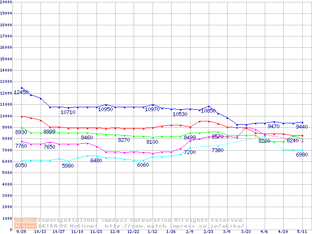 | [↑前グラフ]: | Socket 370 (FC-PGA2,FSB 100MHz,L2 256KB)の最安値推移 |