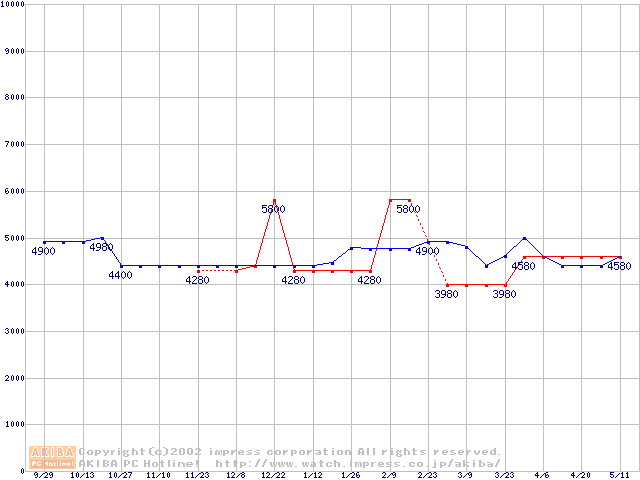 | [↑前グラフ]: | Socket 370 (FC-PGA,FSB 100MHz,L2 128KB)の最安値推移 |