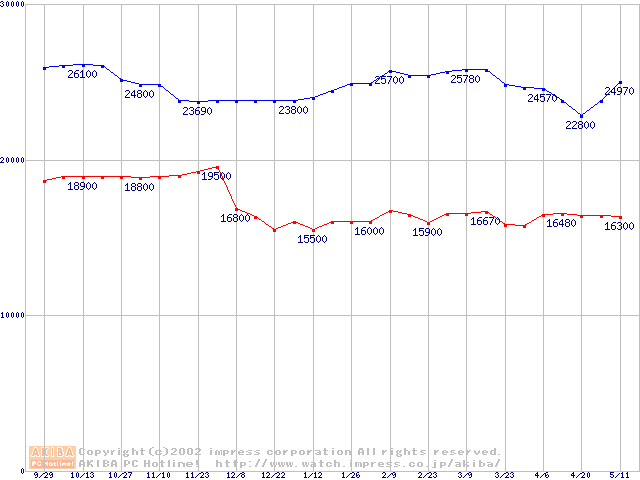 | [↑前グラフ]: | Slot 1 (SECC2,FSB 133MHz,L2 256KB)の最安値推移 |