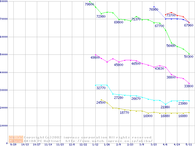 | [↑前グラフ]: | Socket 478 (micro-PGA,FSB 533MHz,L2 512KB,Northwood)の最安値推移 |