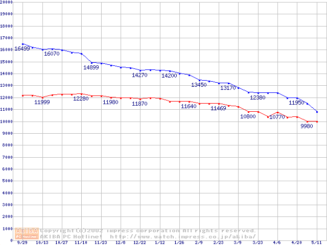 | [↑前グラフ]: | Deskstar 120GXP (7200rpm,UltraATA/100 2MB)の最安値推移 |