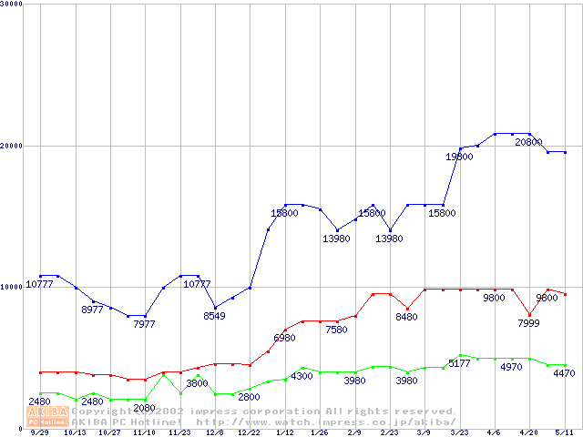 | [↓次グラフ]: | PC133 SDRAM DIMM CasLatency=3 ECC対応 Registeredタイプの最安値推移 |