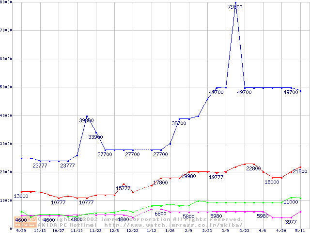 | [↑前グラフ]: | PC133 SDRAM DIMM CasLatency=3 ECC対応の最安値推移 |