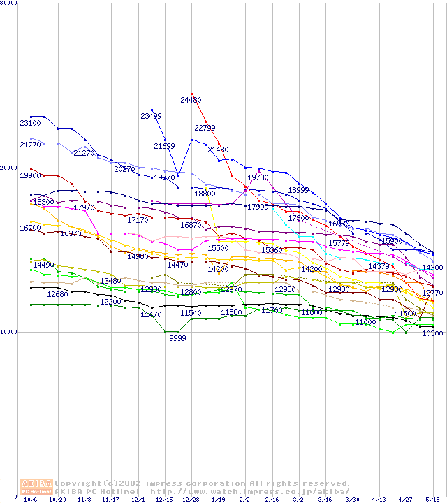 HDD主要製品(最安値1万5千円~2万円未満)の最安値推移