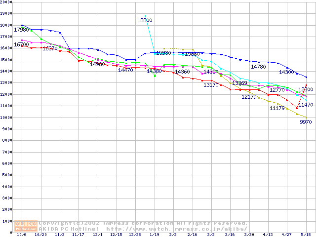| [↑前グラフ]: | HDD 40GB~50GB未満(7200rpmクラス)の最安値推移 |