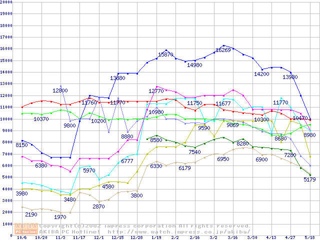 メモリ主要製品(最安値5千円~1万円未満)の最安値推移