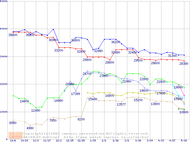 メモリ主要製品(最安値1万円以上)の最安値推移