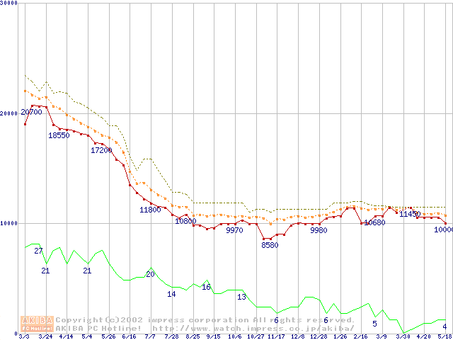 Socket A (Thunderbird,PGA,FSB 200MHz,L2 256KB)の最安値推移