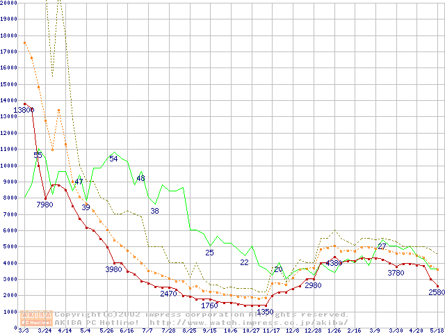 メモリ主要製品(最安値5千円未満)の最安値推移