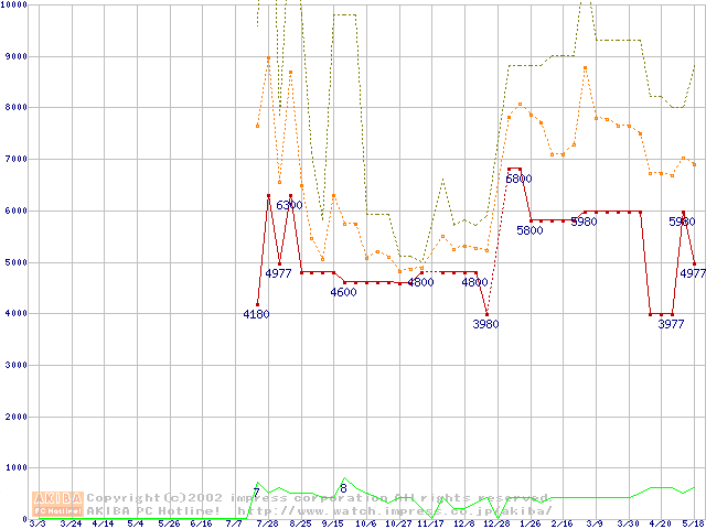 PC133 SDRAM DIMM CasLatency=3 ECC対応 Registeredタイプの最安値推移