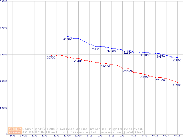 | [↑前グラフ]: | DiamondMax Plus D740X (7200rpm,UltraATA/133,40GB/Platter)の最安値推移 |
