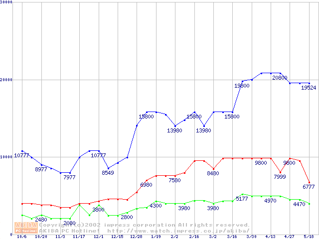 | [↑前グラフ]: | PC133 SDRAM DIMM CasLatency=2の最安値推移 |