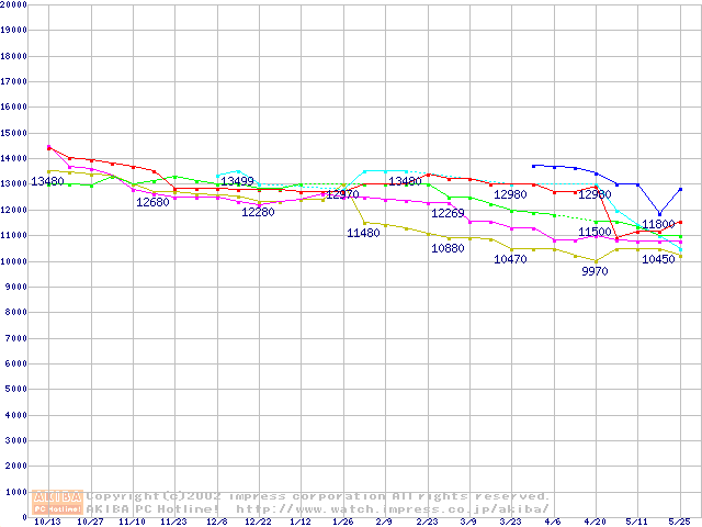 | [↑前グラフ]: | HDD 40GB~50GB未満(5400rpmクラス)の最安値推移 |