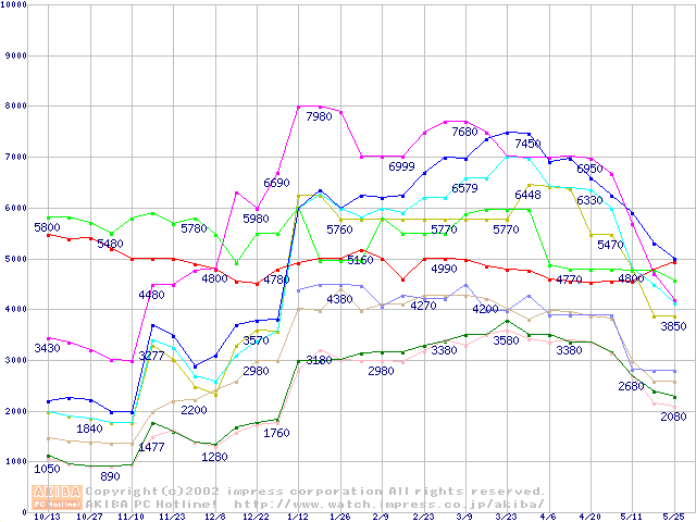 メモリ主要製品の最安値推移
