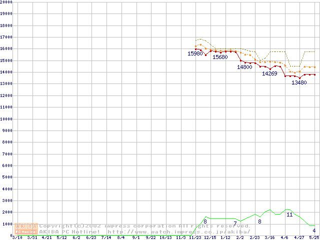 HDD主要製品(最安値1万円~1万5千円未満)の最安値推移