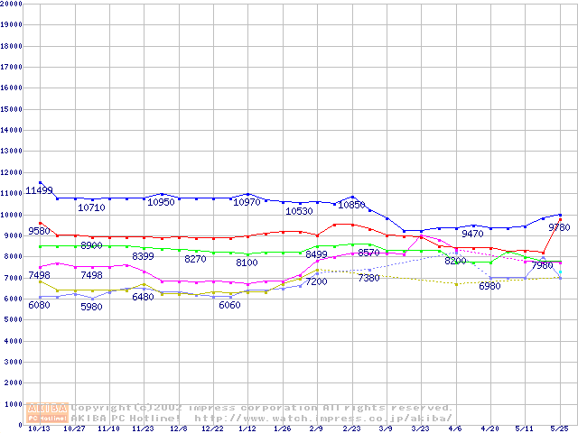 | [↑前グラフ]: | Socket 370 (FC-PGA2,FSB 100MHz,L2 256KB)の最安値推移 |