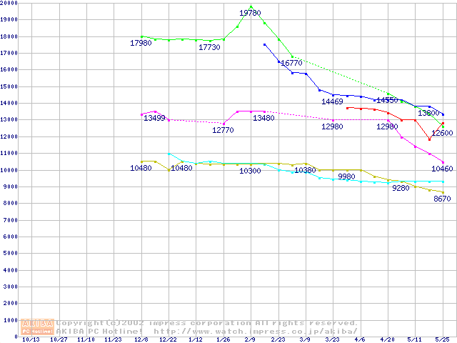 | [↓次グラフ]: | DiamondMax D540X (5400rpm,UltraATA/100,40GB/Platter)の最安値推移 |