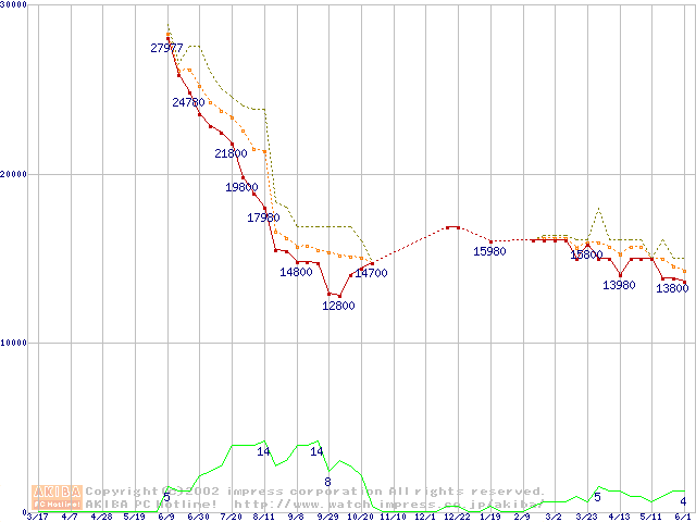 Socket A (Thunderbird,PGA,FSB 200MHz,L2 256KB)の最安値推移