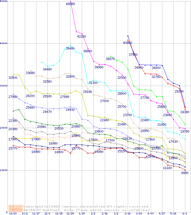 Socket A (Palomino,OPGA,FSB 266MHz,L2 256KB)の最安値推移