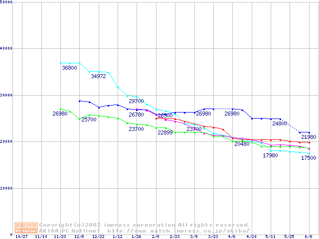 | [↑前グラフ]: | 2.5インチHDD 30GB~40GB未満(9.5mm厚)の最安値推移 |