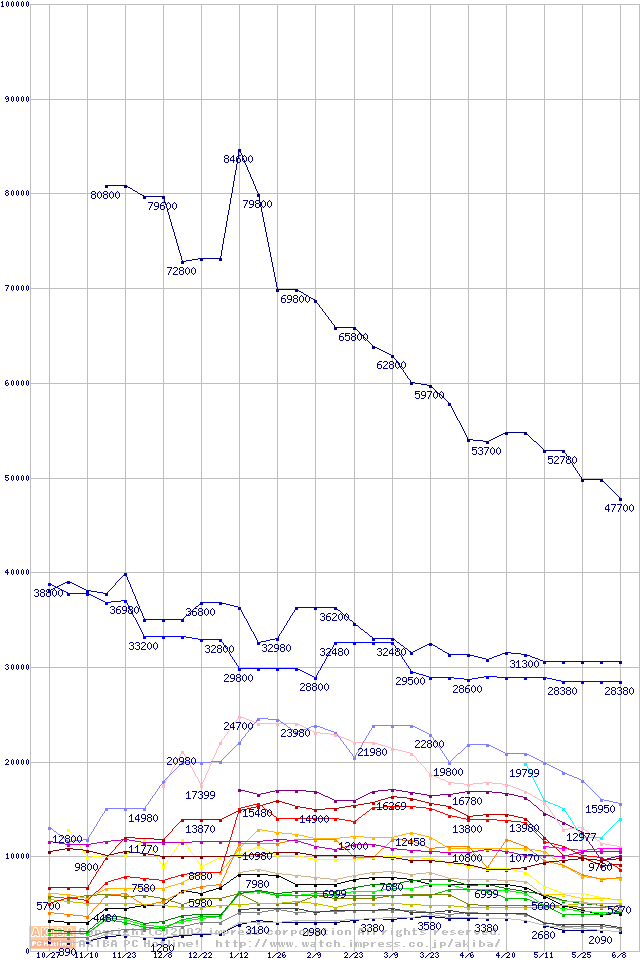 メモリ主要製品(最安値1万円以上)の最安値推移