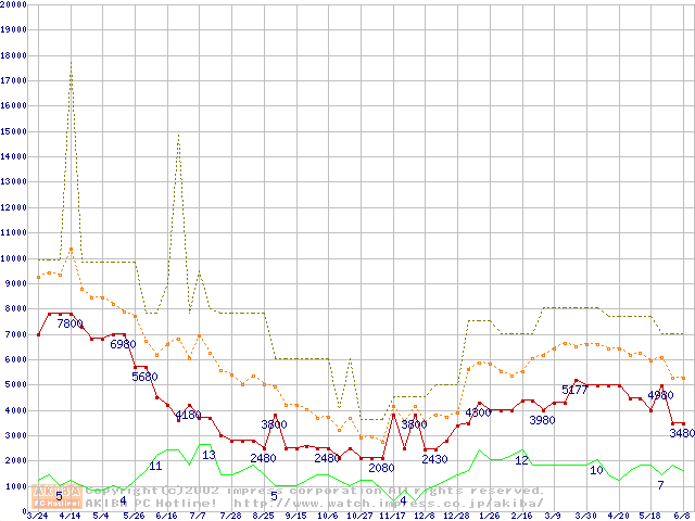 PC133 SDRAM DIMM CasLatency=3 ECC対応の最安値推移