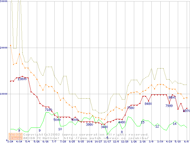 PC133 SDRAM DIMM CasLatency=3 ECC対応の最安値推移