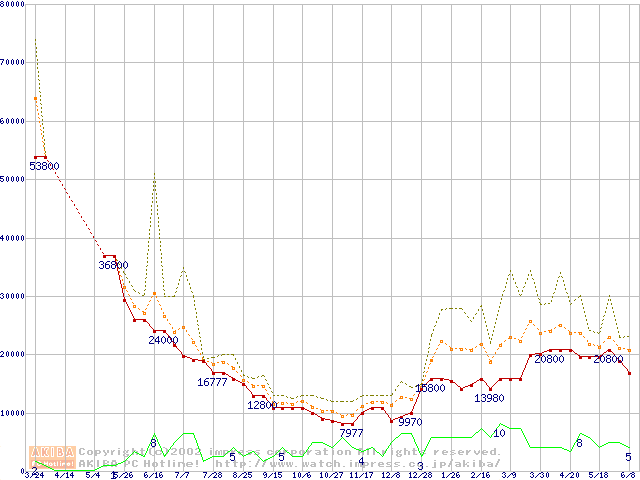 PC133 SDRAM DIMM CasLatency=3 ECC対応の最安値推移