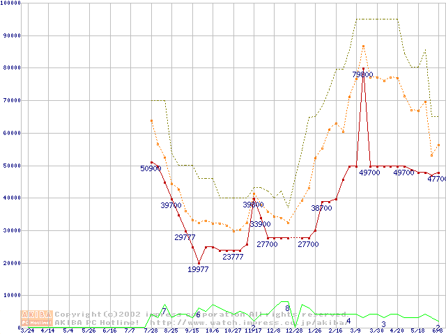 PC133 SDRAM DIMM CasLatency=3 ECC対応 Registeredタイプの最安値推移