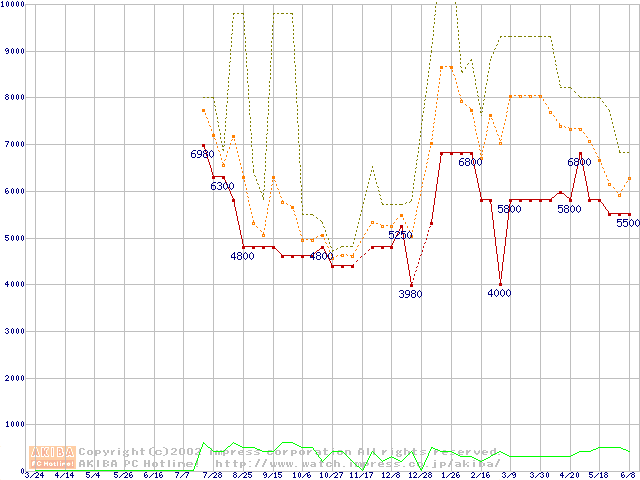 PC100 SDRAM DIMM CasLatency=2 ECC対応 Registeredタイプの最安値推移