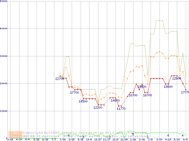 PC100 SDRAM DIMM CasLatency=2 ECC対応 Registeredタイプの最安値推移