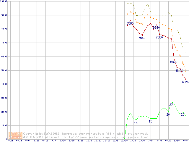 メモリ主要製品(最安値5千円未満)の最安値推移