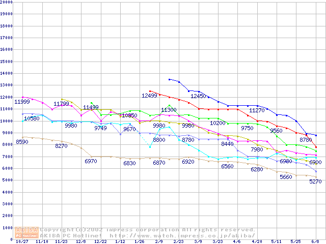 | [↓次グラフ]: | Socket A (Spitfire,PGA,FSB 200MHz,L2 64KB)の最安値推移 |