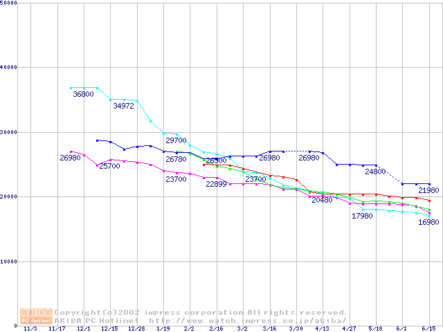 | [↑前グラフ]: | 2.5インチHDD 30GB~40GB未満(9.5mm厚)の最安値推移 |