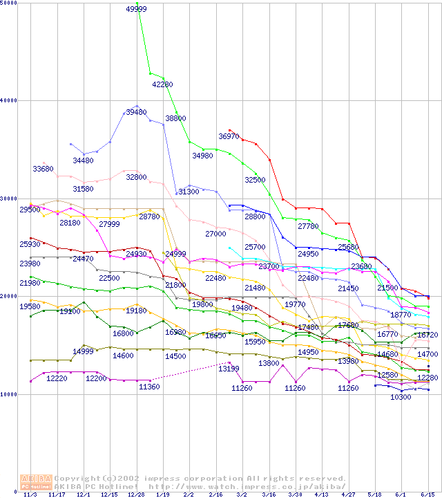 CPU主要製品(最安値1万円~2万円未満)の最安値推移