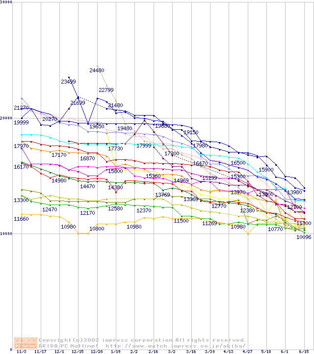 HDD主要製品(最安値1万5千円~2万円未満)の最安値推移
