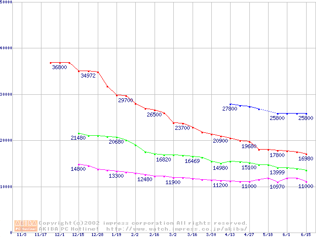| [↓次グラフ]: | Travelstar 15GN (9.5mm,4200rpm,UltraATA/100,512KB,流体軸受)の最安値推移 |