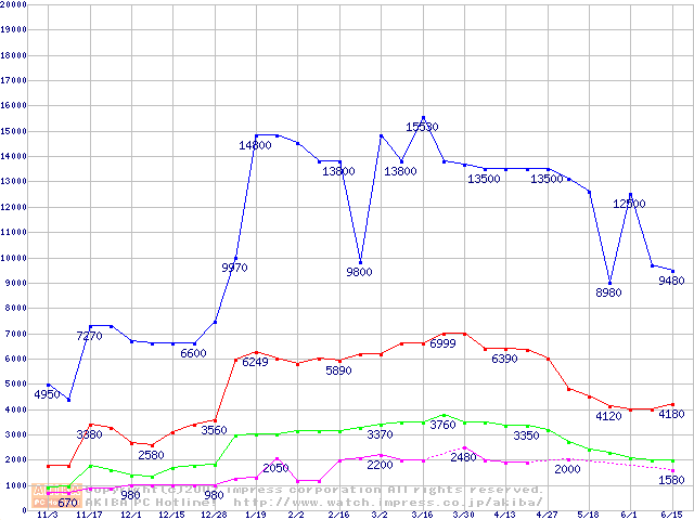 | [↓次グラフ]: | PC100 SDRAM DIMM CasLatency=2 ECC対応の最安値推移 |