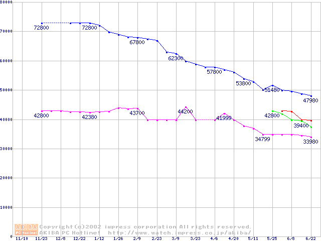 | 2.5インチHDD主要製品(最安値3万円以上)の最安値推移 |